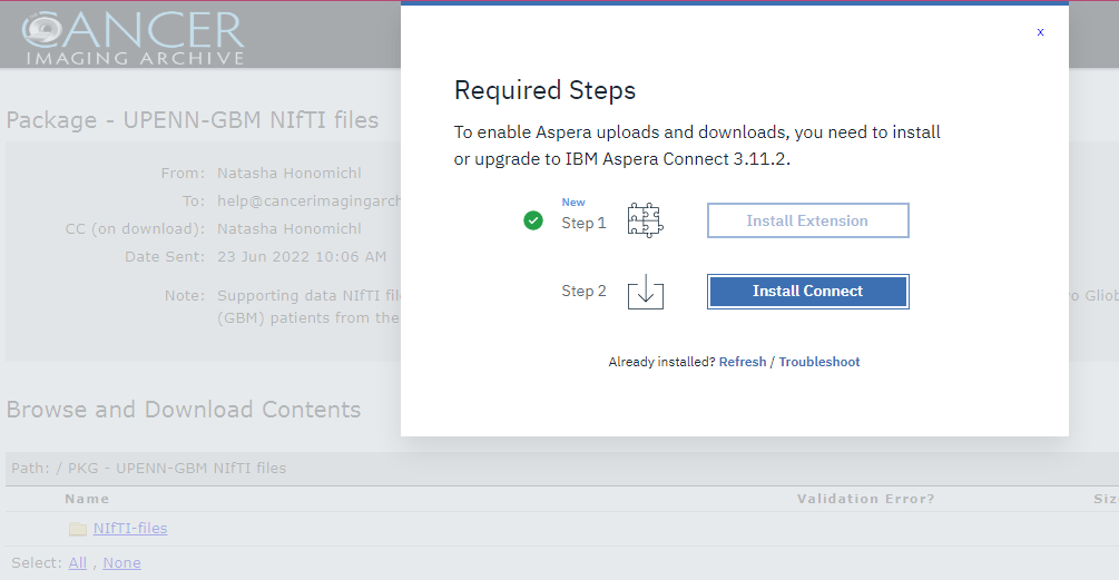 Let’s first download the multiparametric MRI data. You’ll need to install the IBM Aspera Plugin in your browser to download the dataset. This plugin will allow you to pause and resume downloads if needed. When you click on the Download button, Aspera plugin will launch and ask to be added as a browser extension if you are using Chrome.